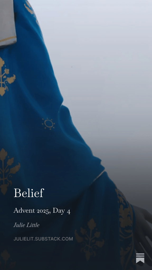 Belief December 3, 2025 ~ Julie Little Advent 2025, Day 4 Find today’s post here Share this: Click to share on X (Opens in new window) X Click to share on Facebook (Opens in new window) Facebook Like Loading... Related