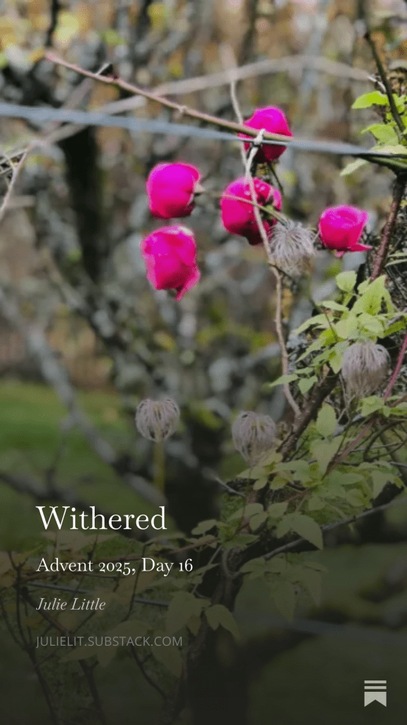 Withered December 15, 2025 ~ Julie Little Advent, Day 16 Share this: Click to share on X (Opens in new window) X Click to share on Facebook (Opens in new window) Facebook Like Loading... Related