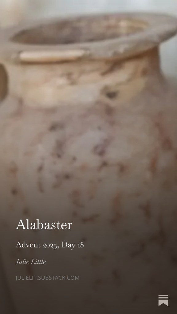 Alabaster December 17, 2025 ~ Julie Little Advent 2025, Day 18 Share this: Click to share on X (Opens in new window) X Click to share on Facebook (Opens in new window) Facebook Like Loading... Related