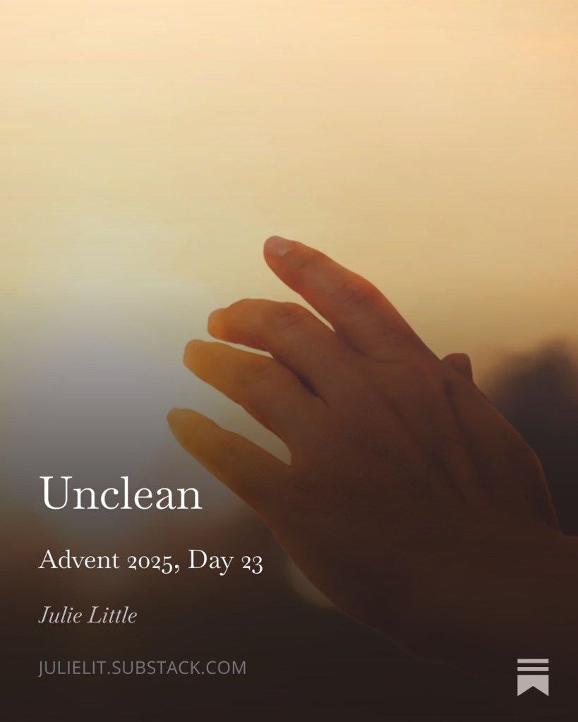 Unclean December 22, 2025 ~ Julie Little Advent 2025,, Day 23 Share this: Share on X (Opens in new window) X Share on Facebook (Opens in new window) Facebook Like Loading... Related